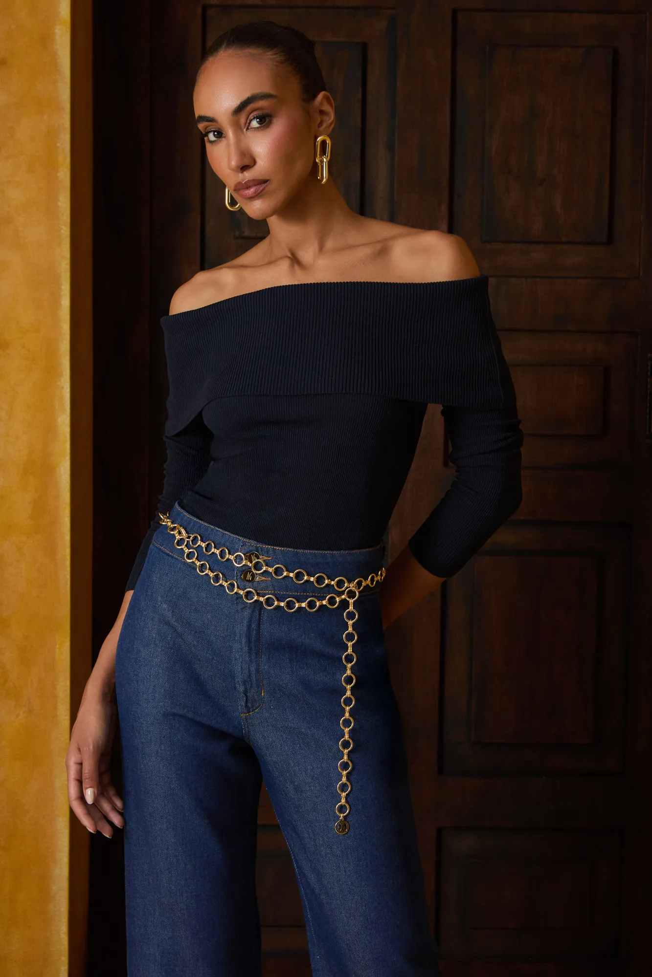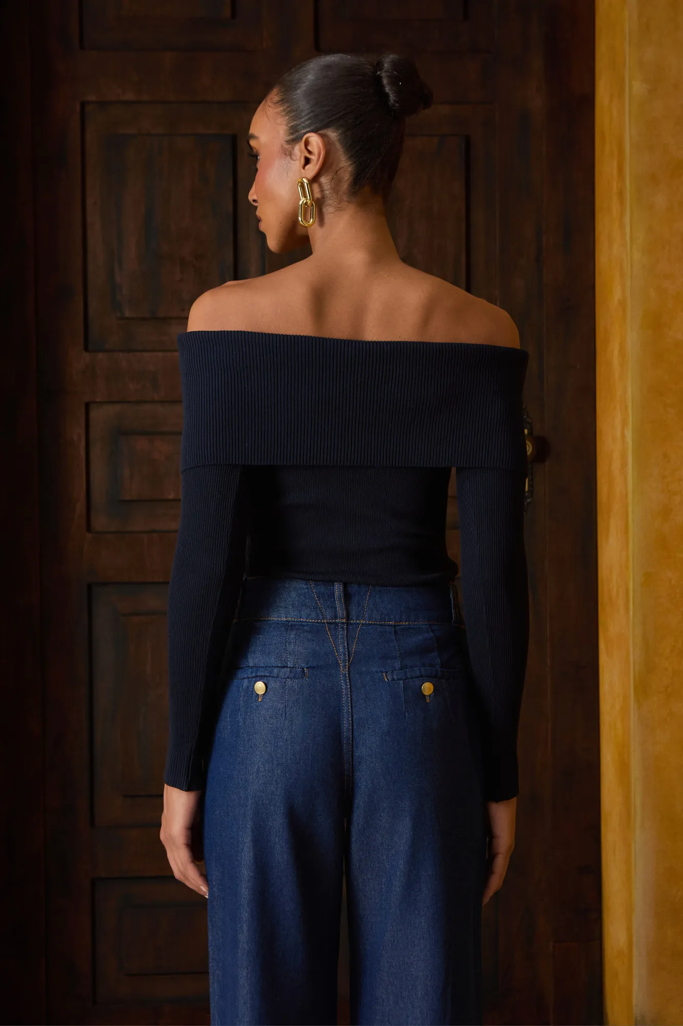 Blusa em tricot. Possui decote ombro a ombro e mangas longas. O caimento é justo com textura canelada ou nervurada.