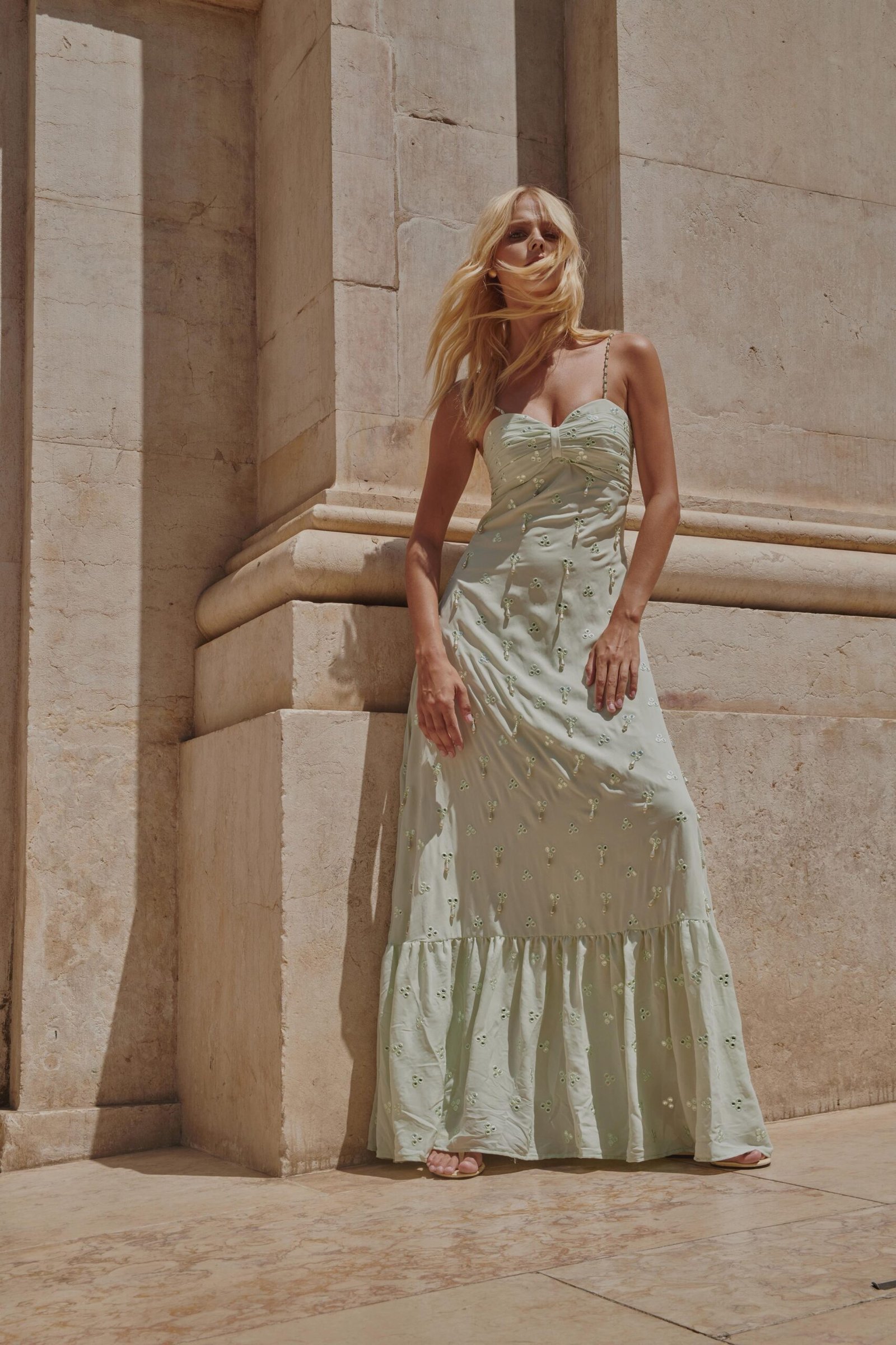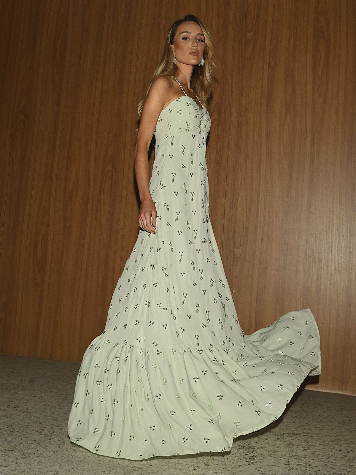 Vestido longo em crepe na cor verde água, com belíssimo bordado e miçangas nas cores do vestido.