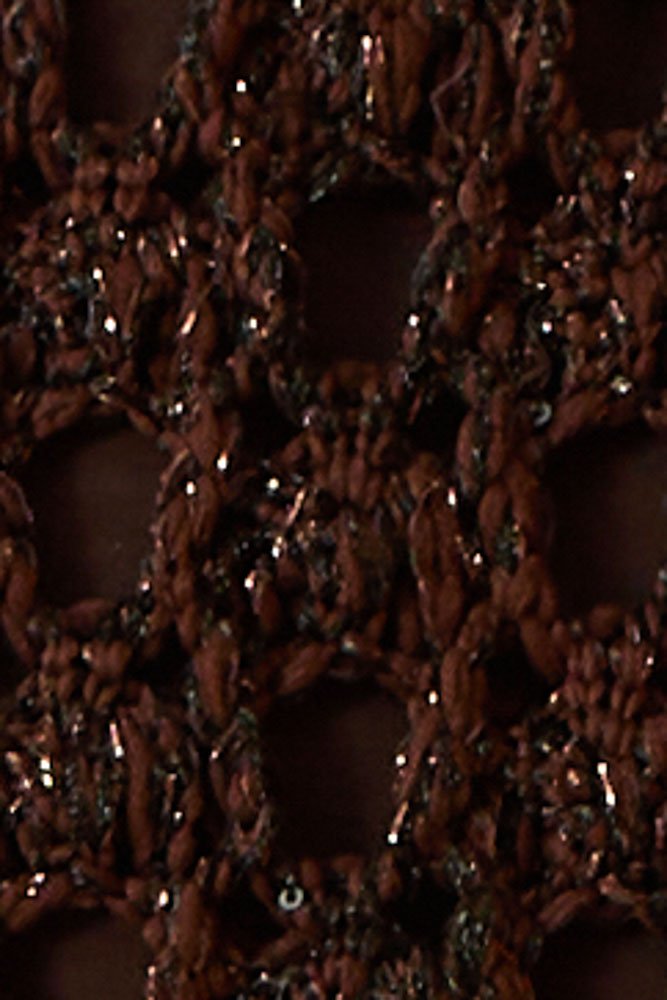 Vestido midi na cor Café, confeccionado em tricot malha de crochê com fios de lurex. Possui modelagem ajustada, decote redondo, sem mangas e barra assimétrica com longas franjas volumosas.
